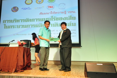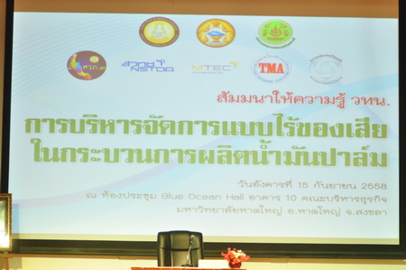 การสัมมนาให้ความรู้ วทน. "เรื่องการบริหารจัดการแบบไร้ของเสียในกระบวนการผลิตน้ำมันปาล์ม (Zero Waste Management in Palm Oil Production)" โดยมีนายเอกรัฐ หลีเส็น รองผู้ว่าราชการจังหวัดสงขลา เป็นประธานเปิดงาน ณ ห้องประชุม Blue Ocean Hall อาคารคณะบริหารธุรกิจ ม.หาดใหญ่ วันที่ 15 กันยายน 2558