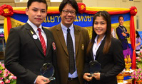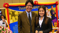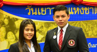 นายรณกฤต แก้วละเอียด นักศึกษาคณะนิเทศศาสตร์ และ นางสาวเสาวภาคย์ ทิพย์สงคราม นักศึกษาคณะศิลปศาสตร์และศึกษาศาสตร์.